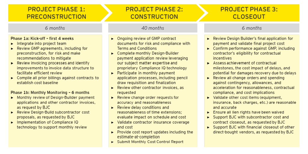 A fully integrated project controls audit system provides comprehensive structured reviews throughout the entire construction delivery process while focusing and aligning targeted metrics with project costs and objectives to ensure the Owners project risk is protected.